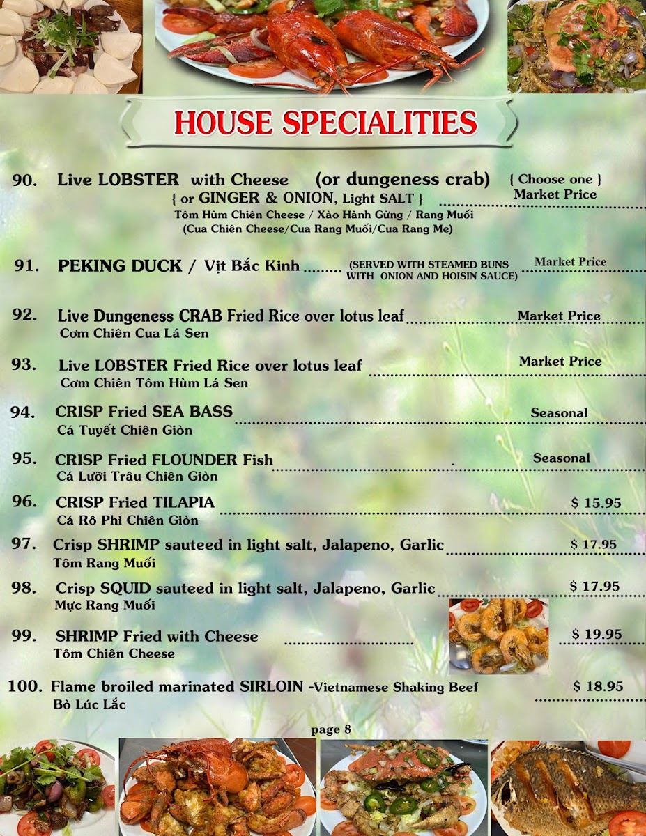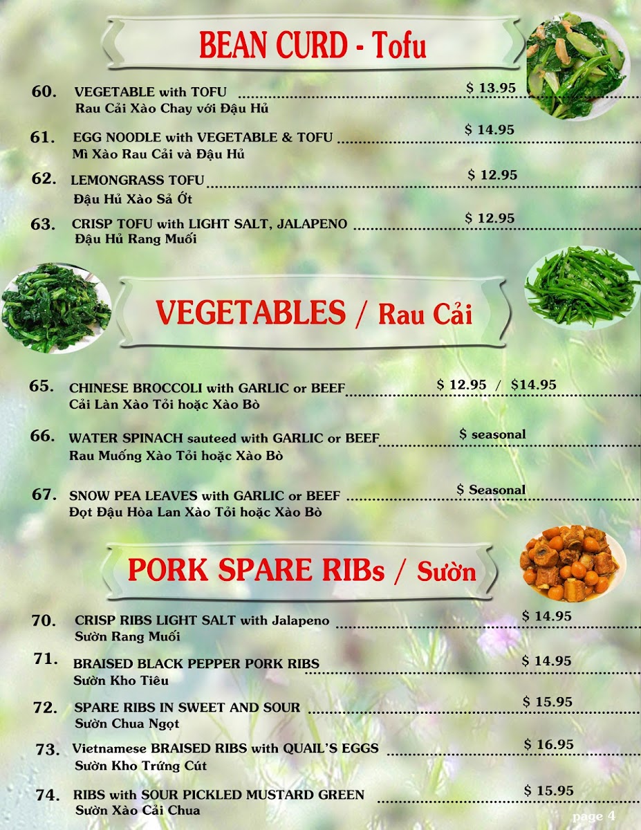 The menu is a vibrant tapestry of flavors, featuring Hủ Tiếu dishes like Wonton Noodle Soup and various noodle soups, each crafted with care. Pork lovers will savor the Braised Black Pepper Pork Ribs and Spare Ribs in Sweet and Sour, all showcasing authentic cooking techniques and tantalizing spices.